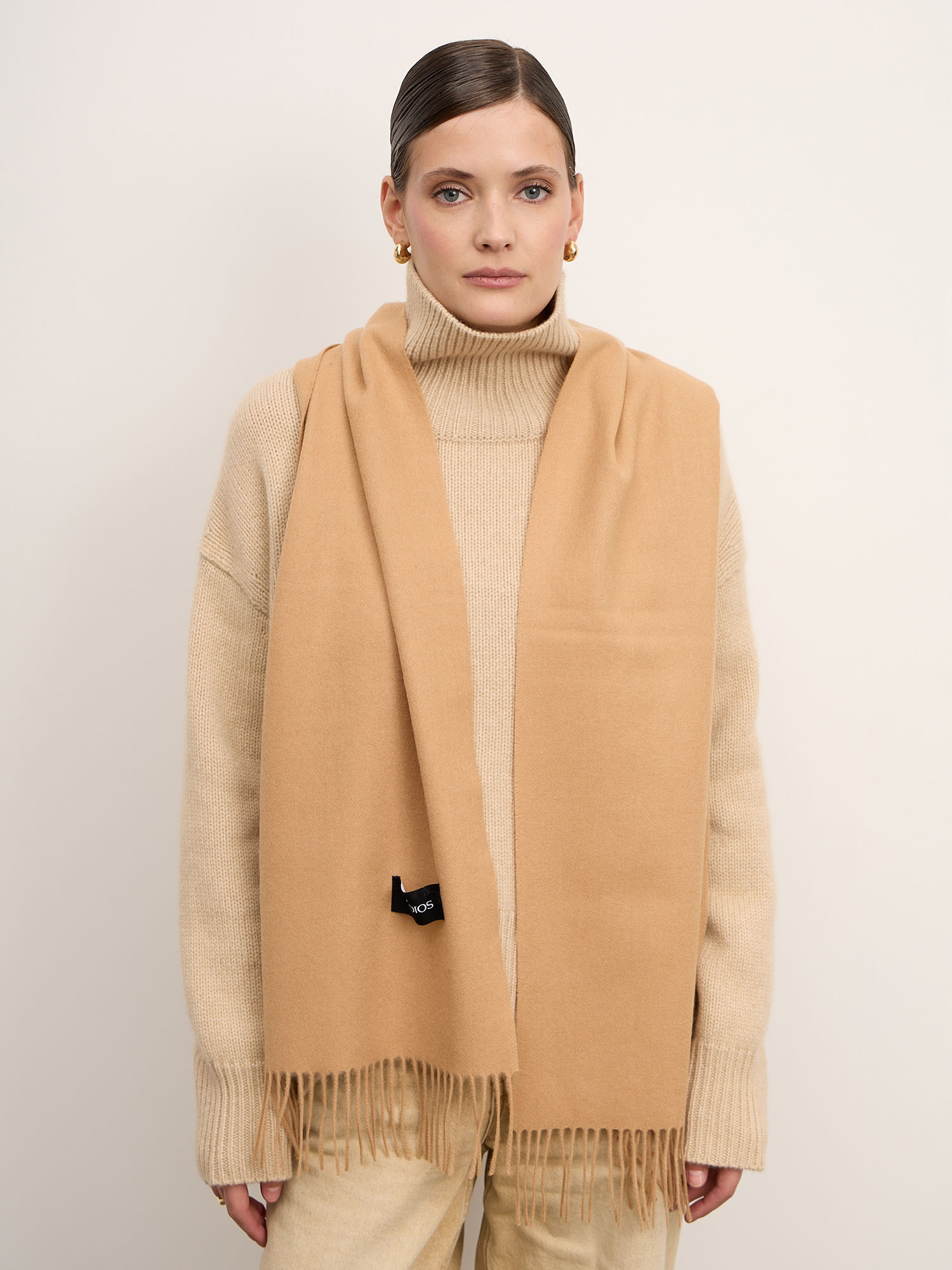 Классический прямоугольный формат позволяет носить шарф различными способами — свободно на плечах, обернув вокруг шеи или создавая многослойные образы. Минималистичный дизайн подчёркивает натуральную фактуру кашемира. Края изделия дополнены аккуратной бахромой, придающей шарфу завершённый и аккуратный вид.