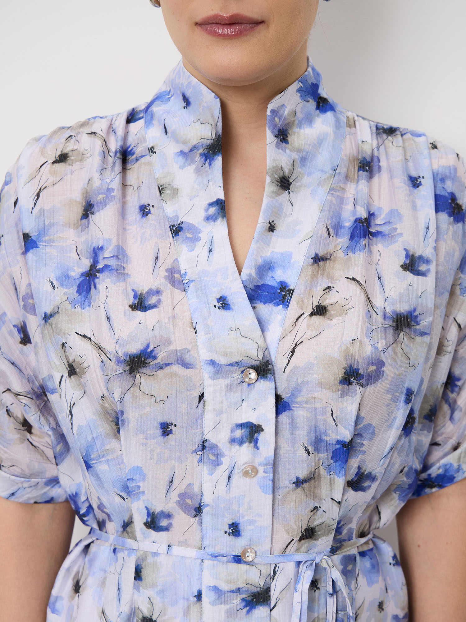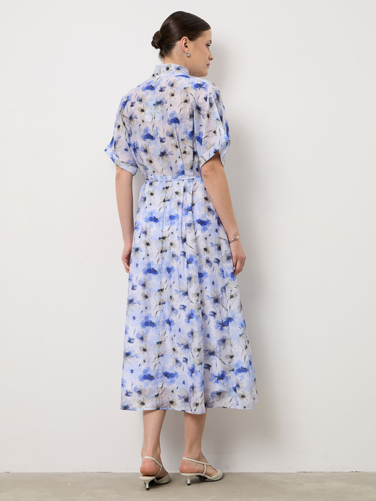 Модель выполнена с аккуратным воротником и застёжкой на пуговицы спереди. Короткие рукава и длина миди создают элегантный силуэт, а нежный цветочный принт делает образ более выразительным и женственным.