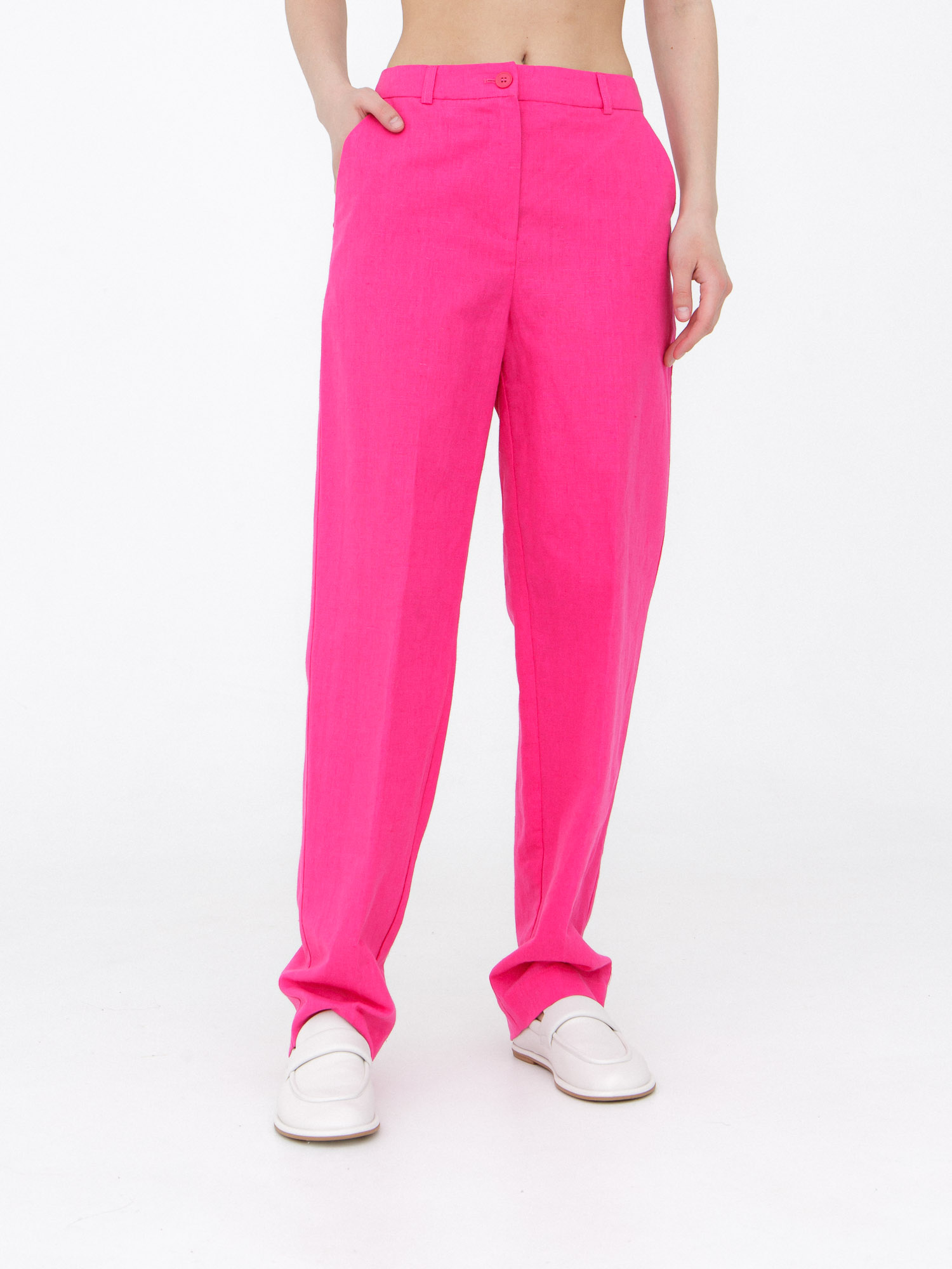 Женские брюки из льна и хлопка в оттенке фуксия — яркая и стильная модель для летнего гардероба. Эффектный цвет в сочетании с лаконичным кроем создает выразительный образ, который подходит как для повседневной носки, так и для более собранных аутфитов. Легкая ткань обеспечивает комфорт в течение всего дня.