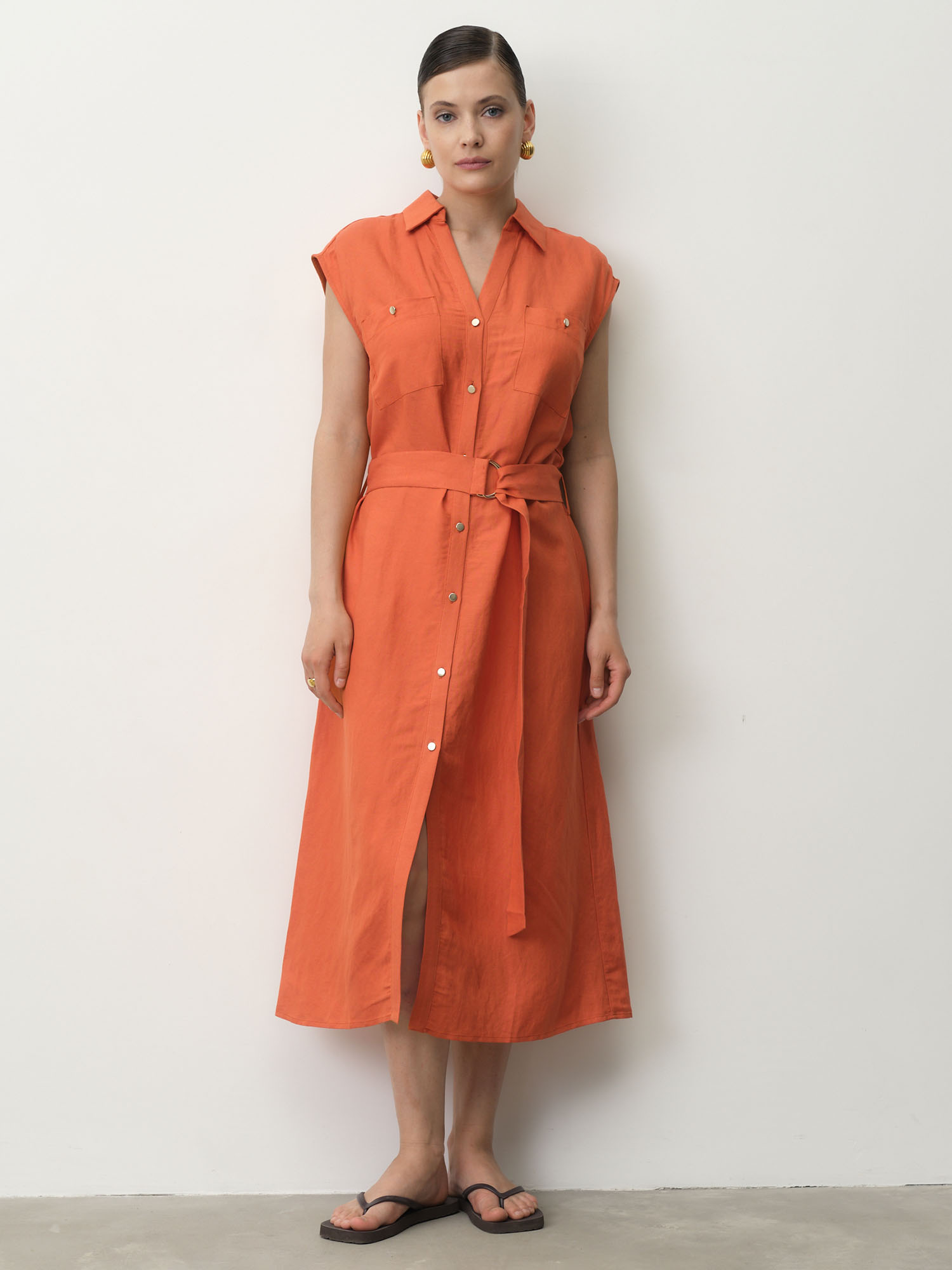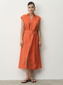 Платье миди длины с приталенным силуэтом и акцентом на талии. Классический воротник и лаконичный крой создают аккуратный и стильный образ.