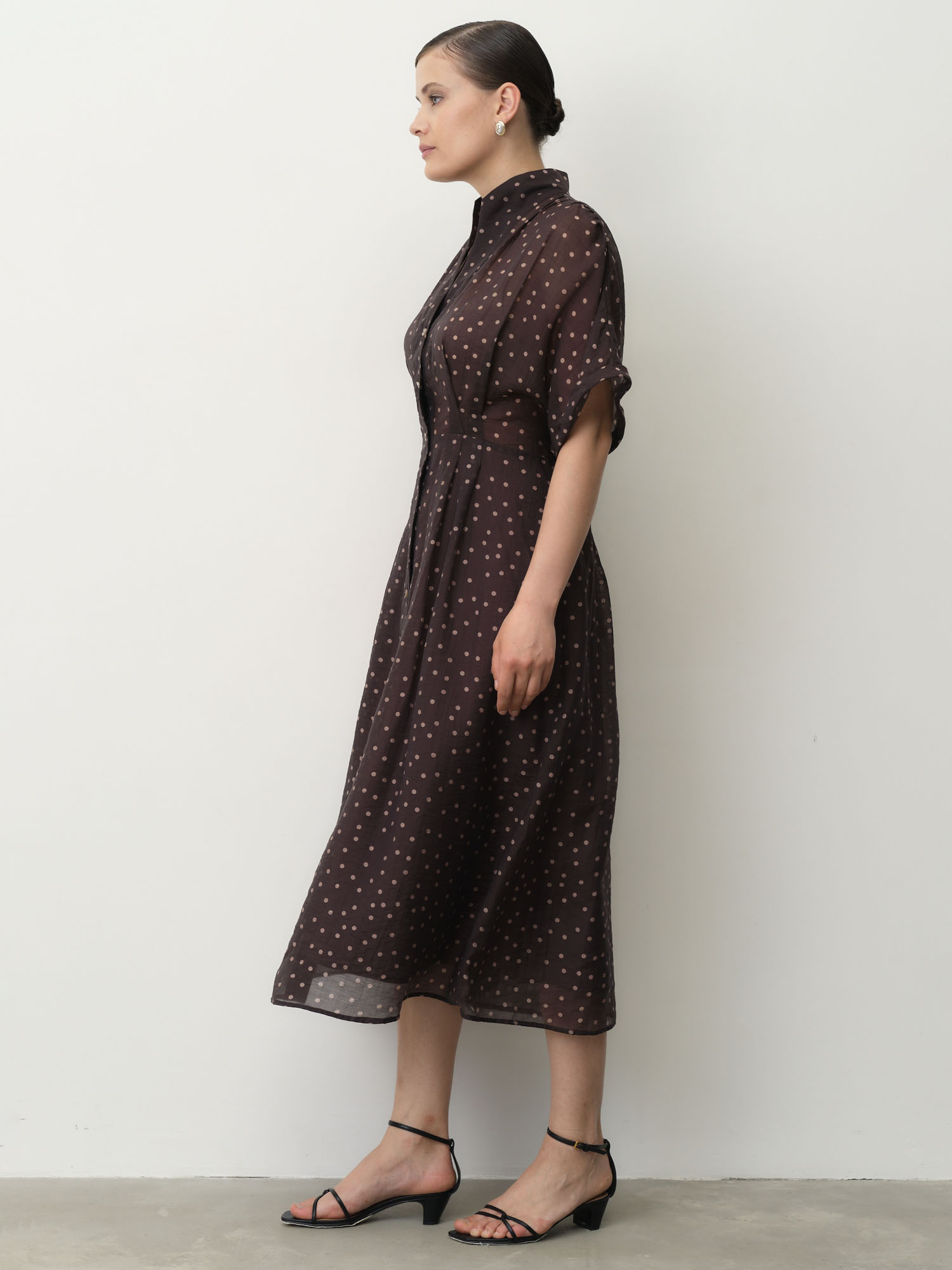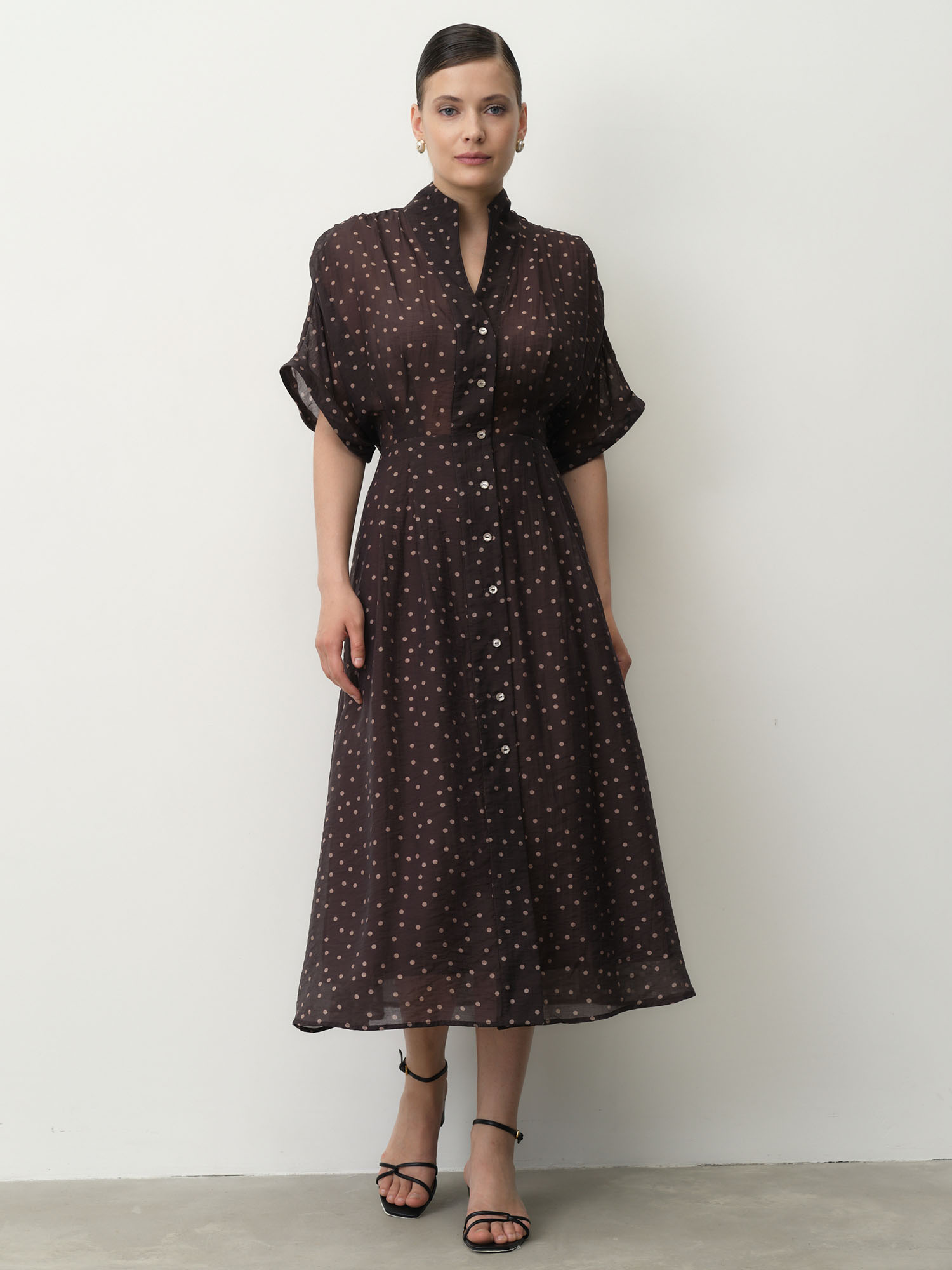 Коричневый в горошек — теплое и стильное сочетание, придающее образу мягкость и выразительность.