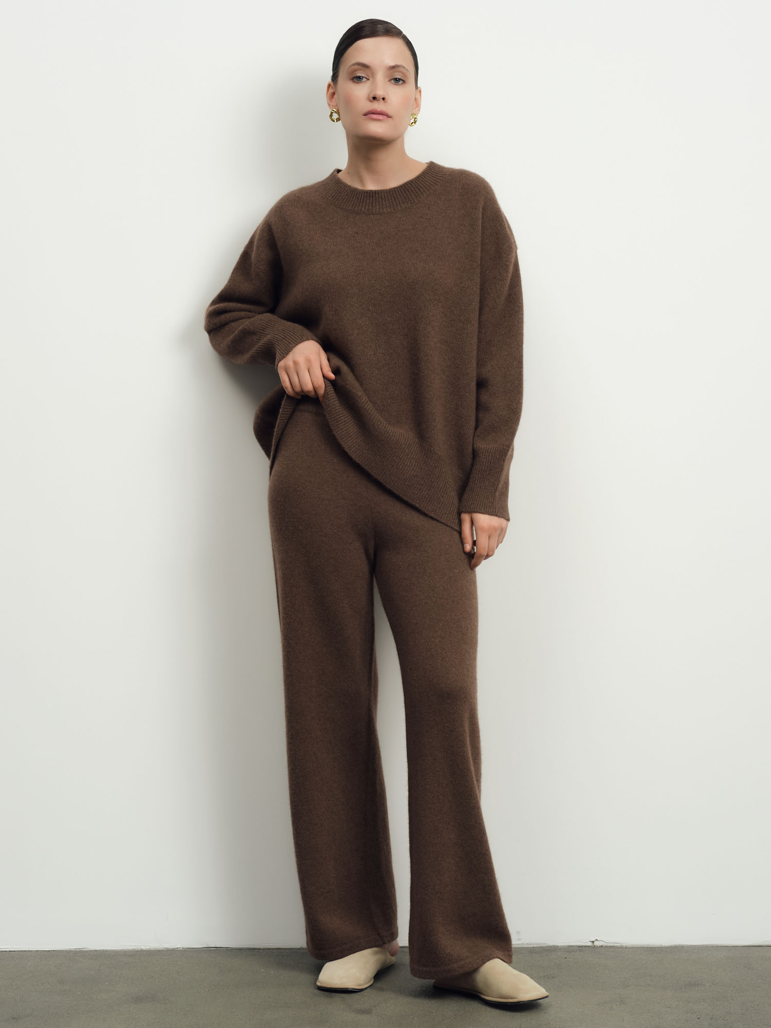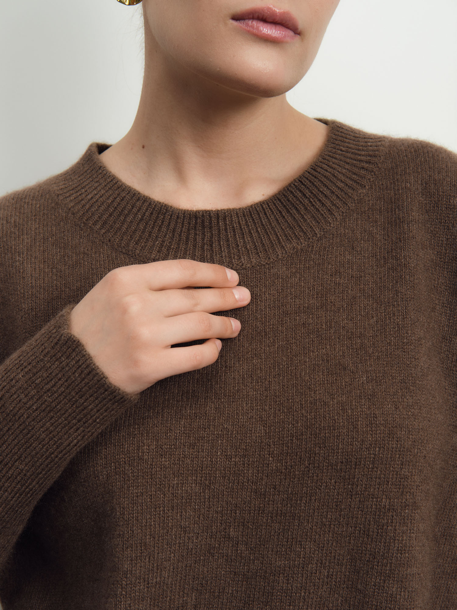 Модель выполнена в минималистичном стиле с круглой горловиной и гладкой вязкой. Прямой силуэт и лаконичные линии подчёркивают благородную фактуру натурального материала.