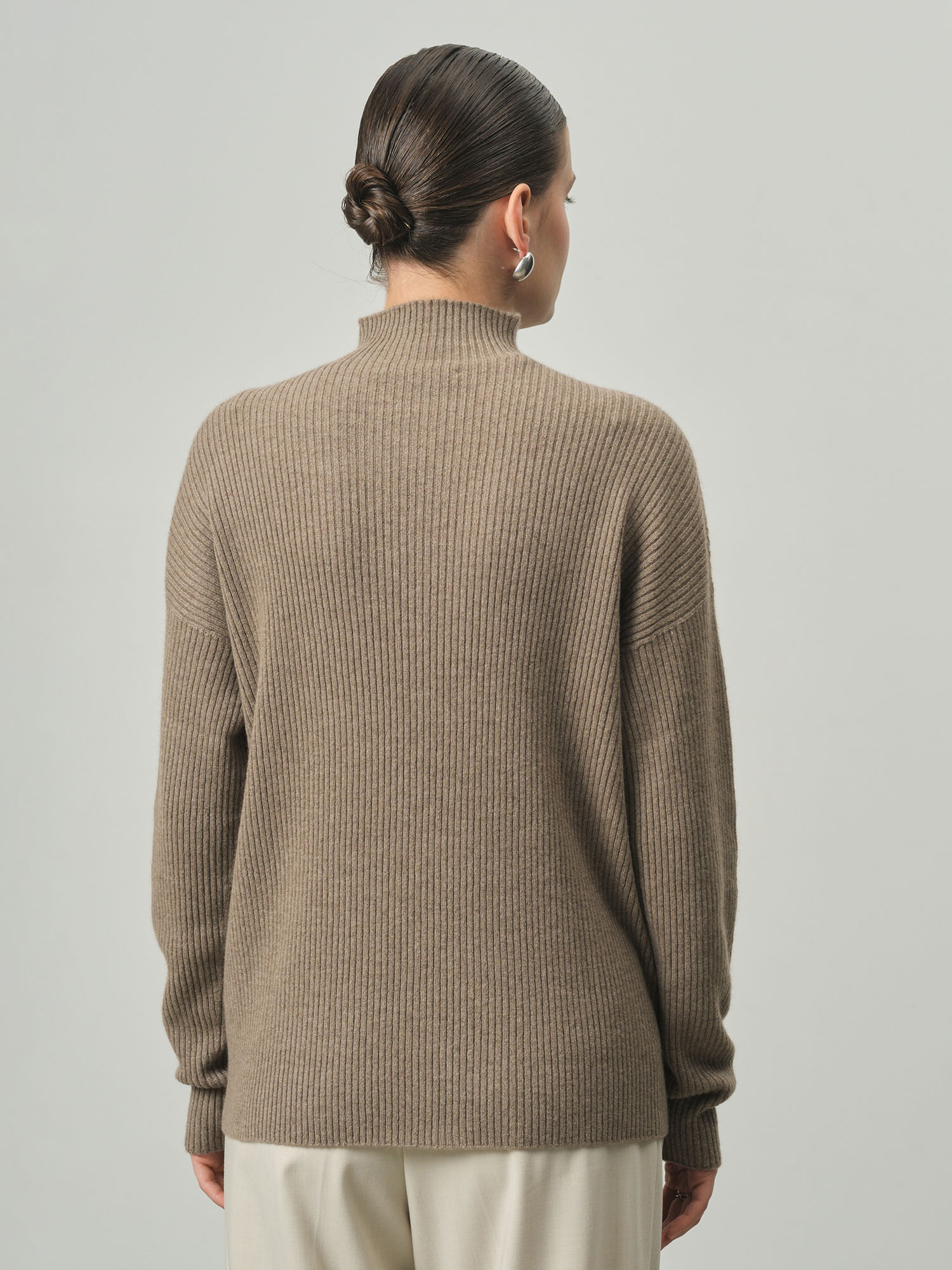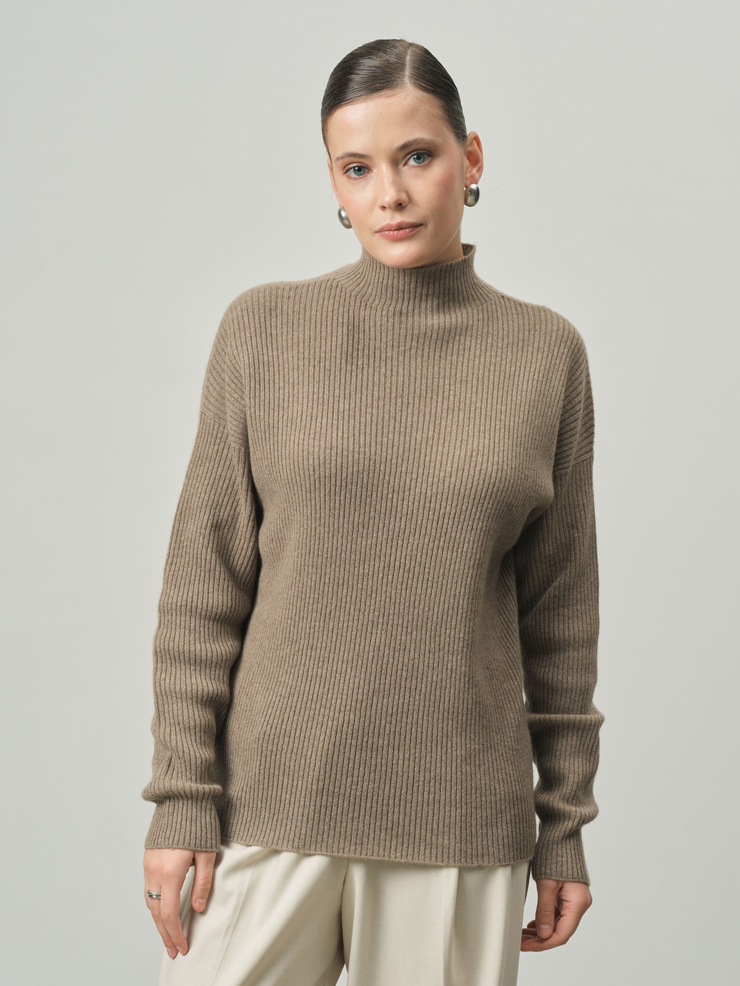 Модель выполнена в минималистичном стиле с аккуратным высоким воротником и гладкой вязкой. Чистые линии и простой силуэт подчёркивают благородную текстуру материала.