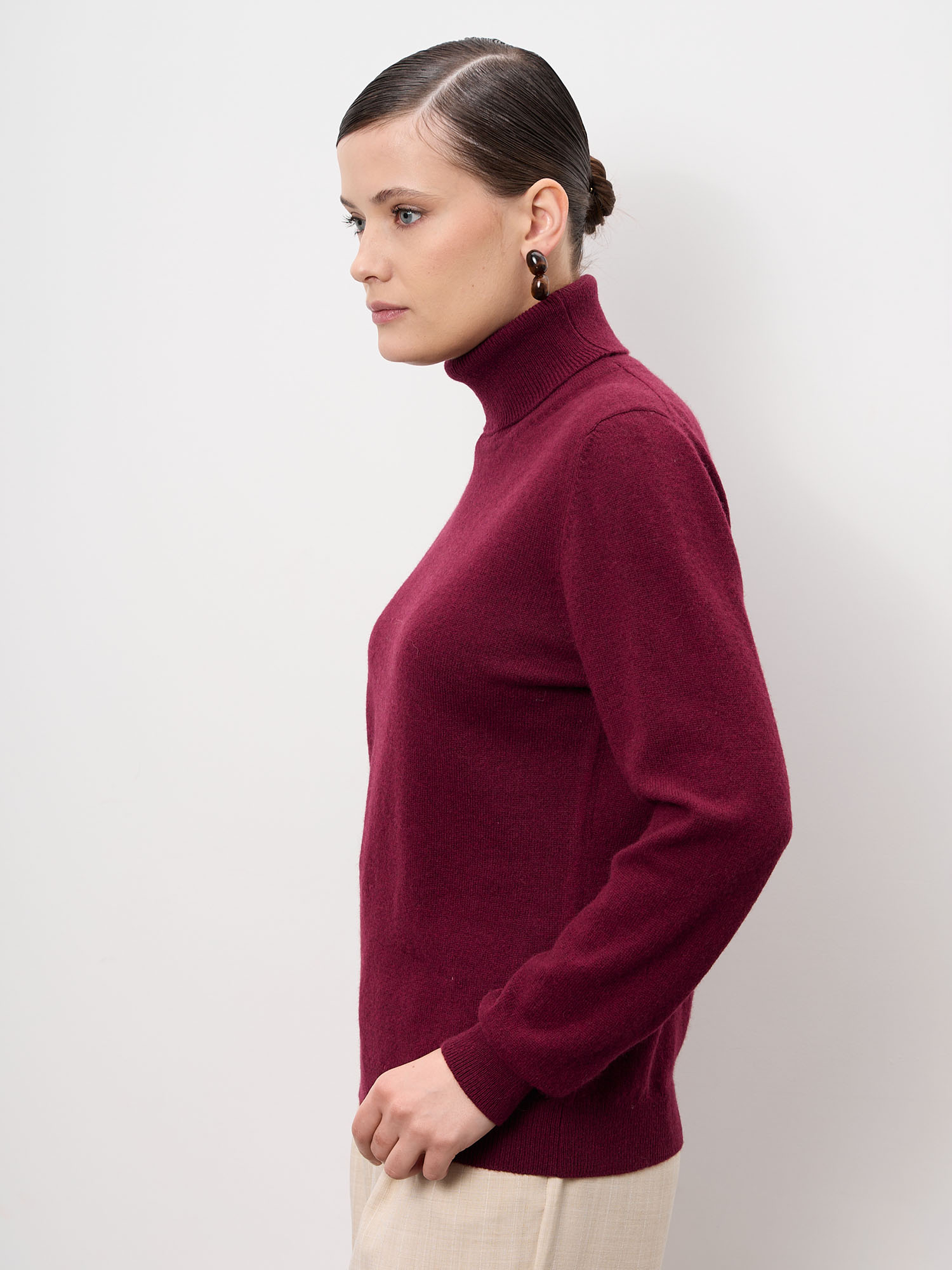 Элегантная женская водолазка из натурального пуха яка — базовая модель с благородным оттенком бургунди. Лаконичный дизайн и безупречная посадка делают её универсальной основой гардероба для холодного сезона.