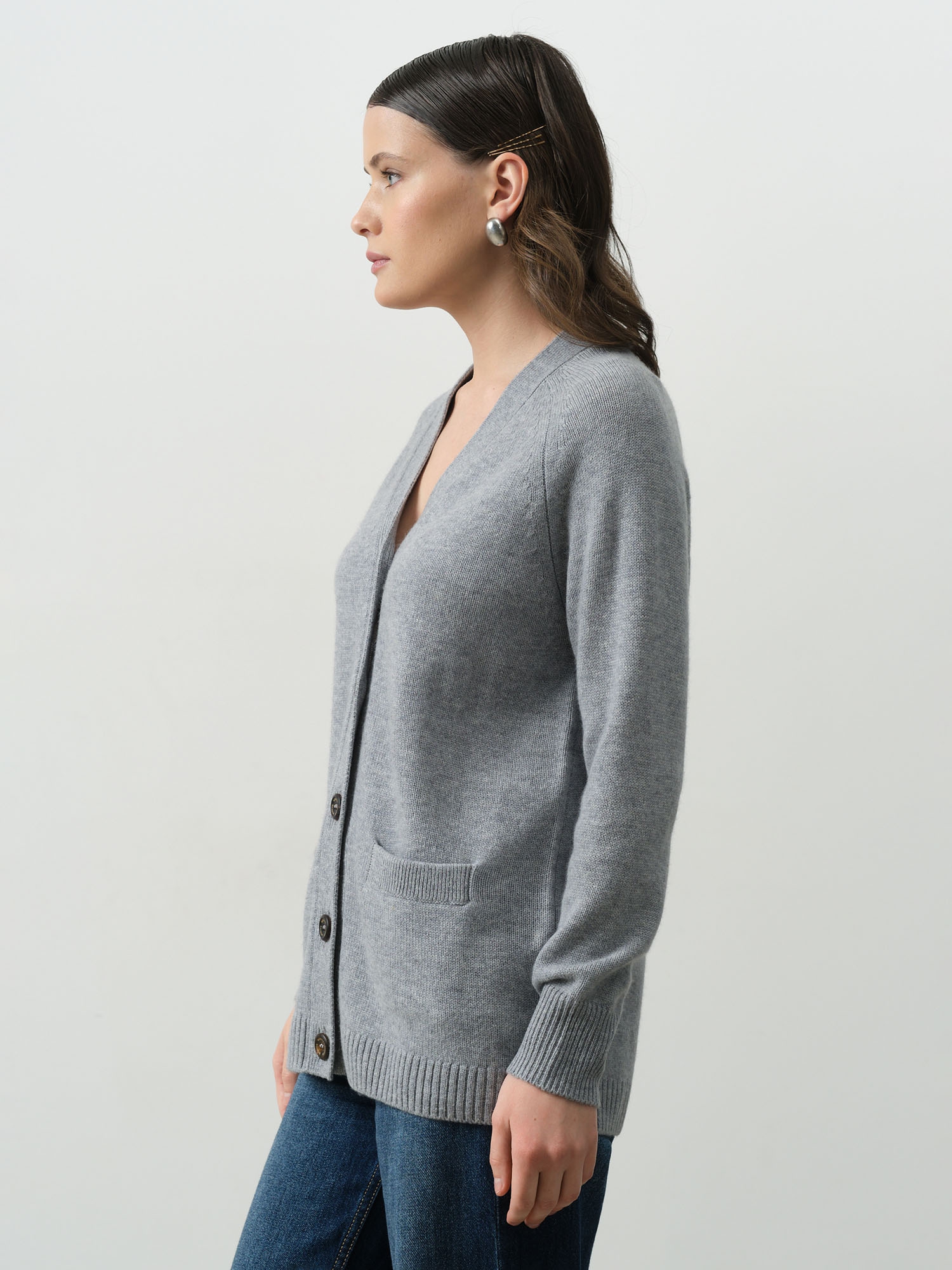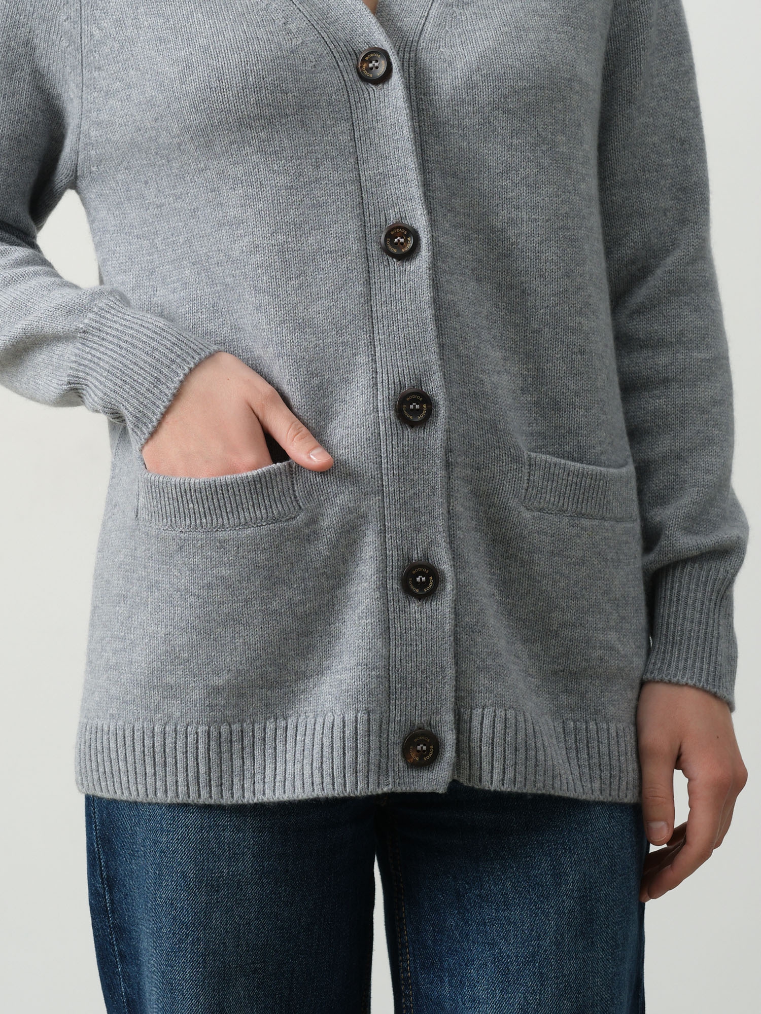 Модель выполнена с V-образным вырезом и застёжкой на пуговицы. Классический крой и минималистичный стиль делают кардиган универсальным элементом базового гардероба.