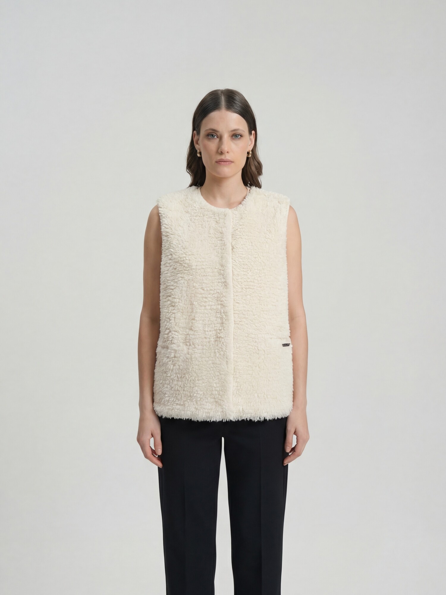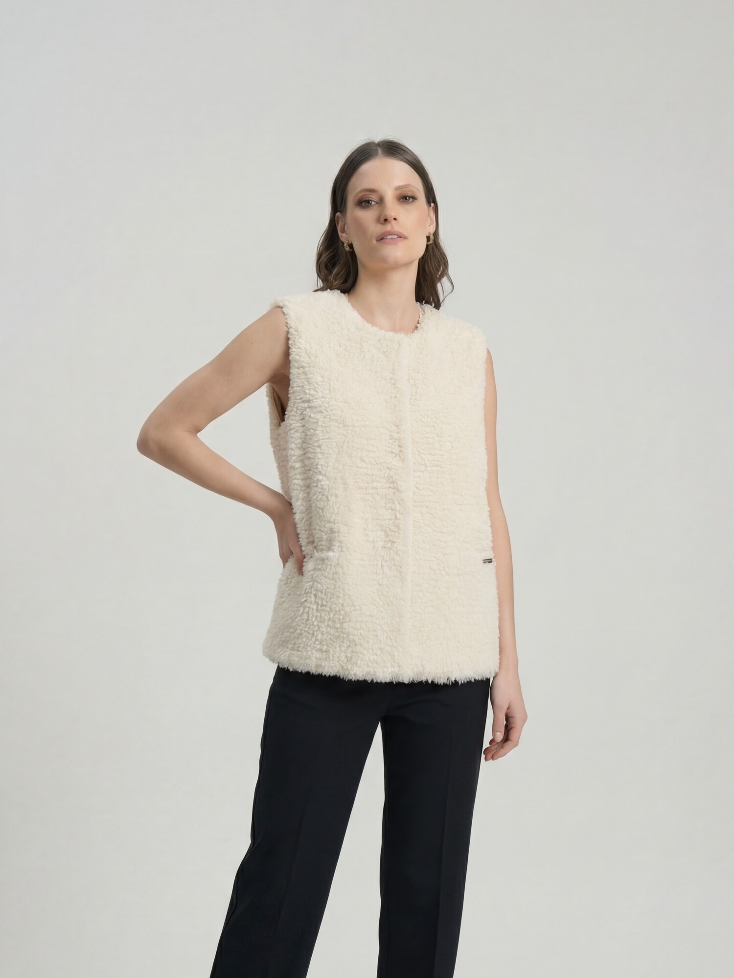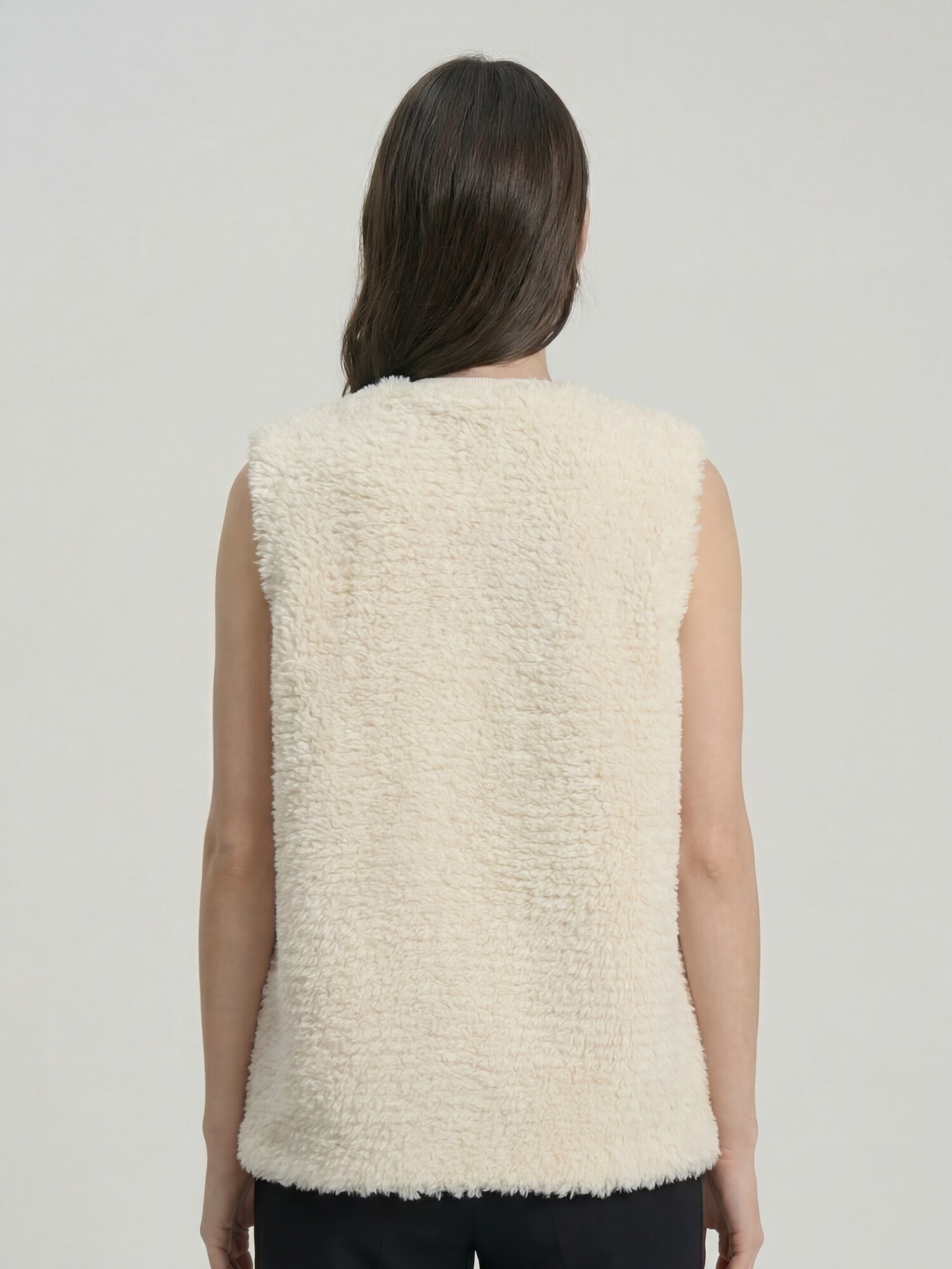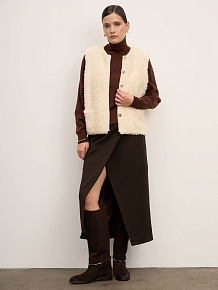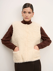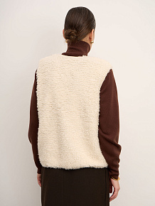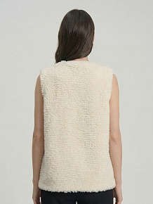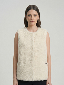 Модель без рукавов с округлой горловиной. Фактурная поверхность с эффектом «пушистой» вязки придаёт изделию объём и визуальную глубину, создавая современный и уютный образ.