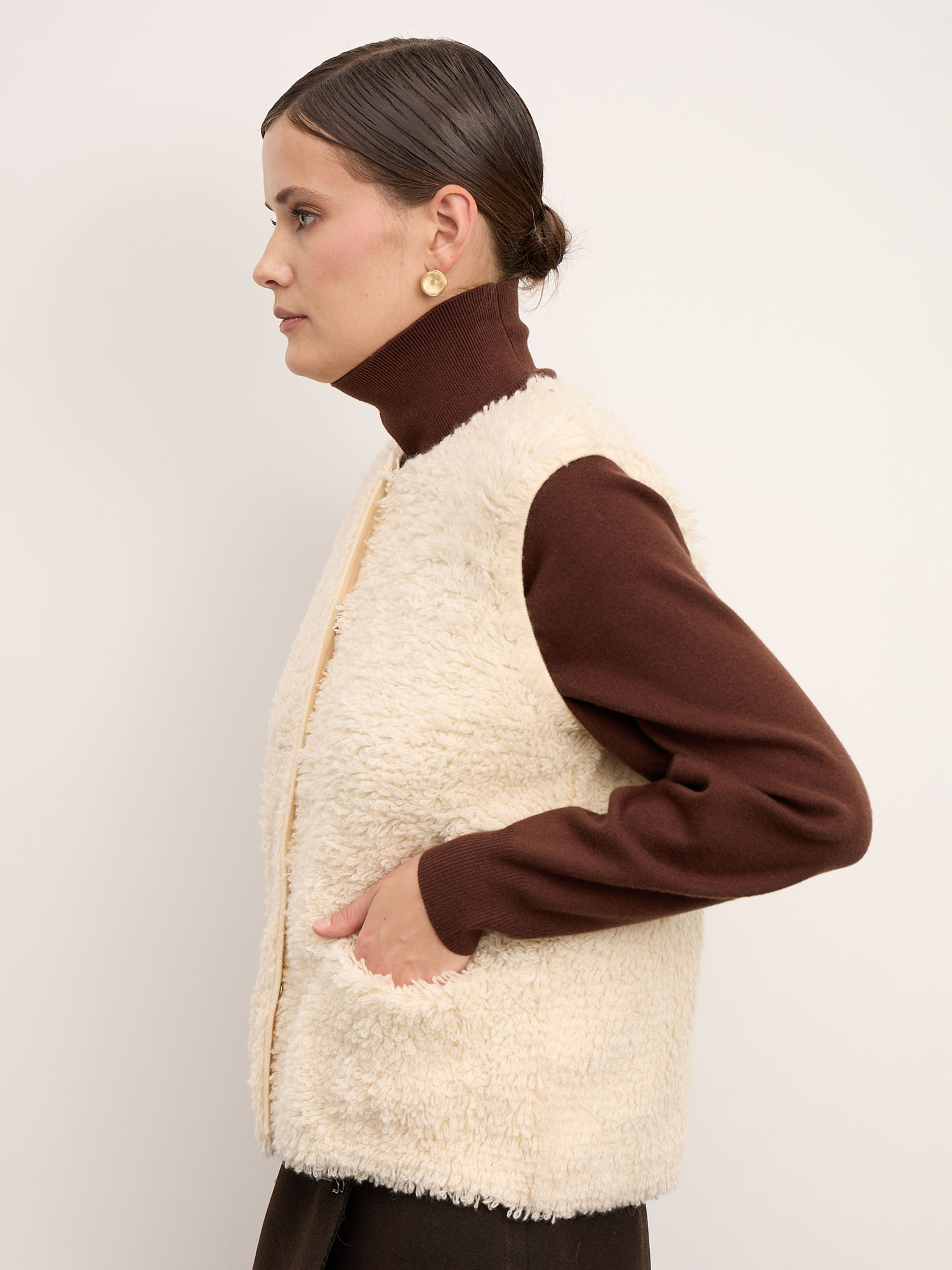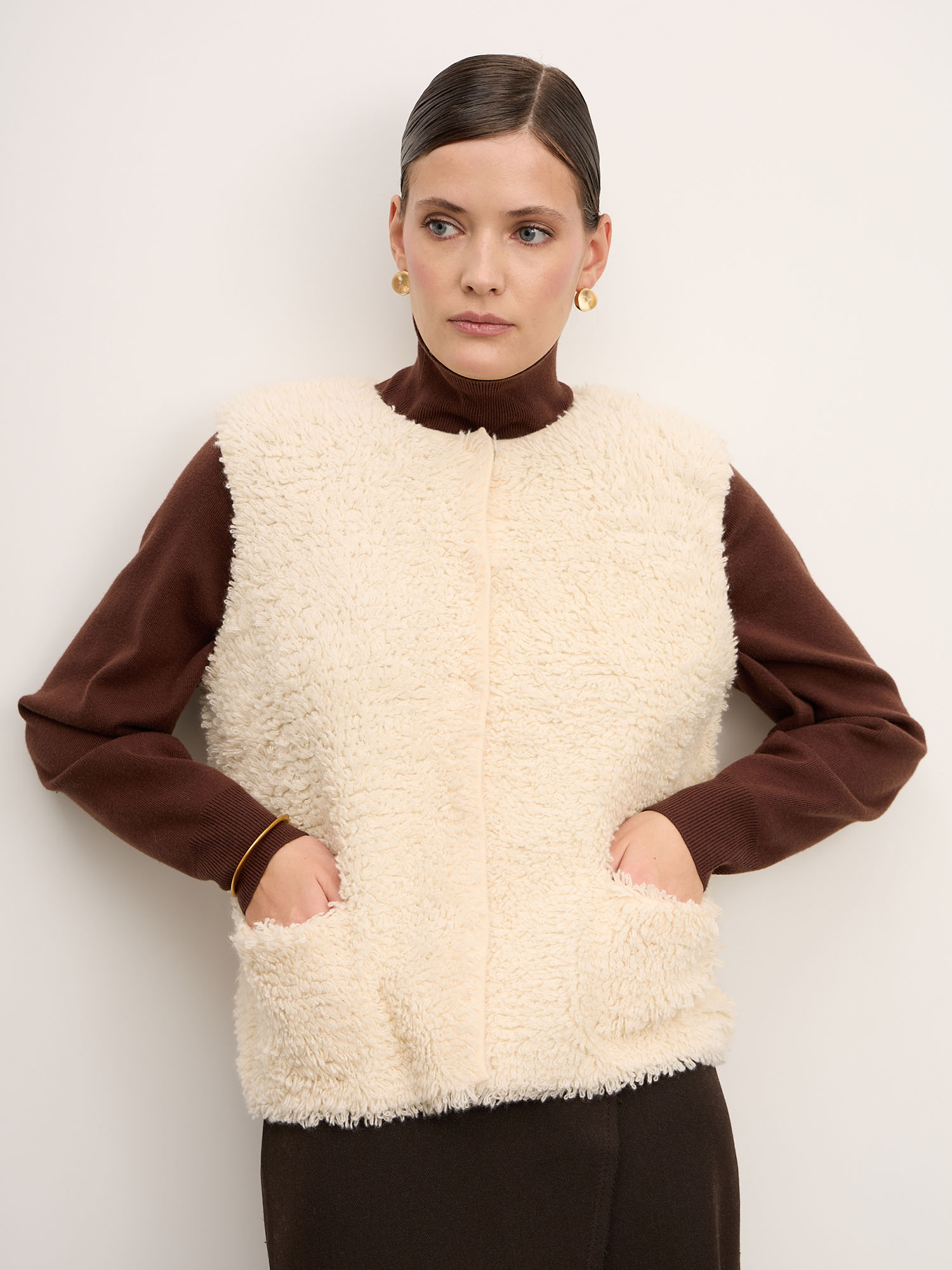 Женский жилет из кашемира — стильная и утончённая модель, которая сочетает в себе комфорт и выразительную фактуру. Лаконичный крой и мягкий объёмный материал делают изделие акцентной частью гардероба, идеально подходящей для создания многослойных образов.